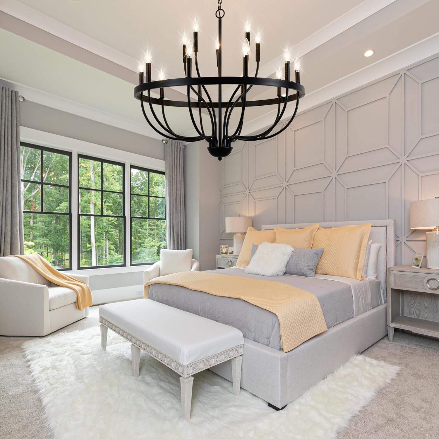 This eye-catching 15-light chandelier brings a touch of sophistication to any room with its striking matte black finish. Designed with a durable metal construction that resists rust, it stands the test of time and maintains its pristine look with minimal maintenance. The unique triple-candle light design offers a classic, timeless aesthetic that perfectly complements modern and traditional interiors alike.